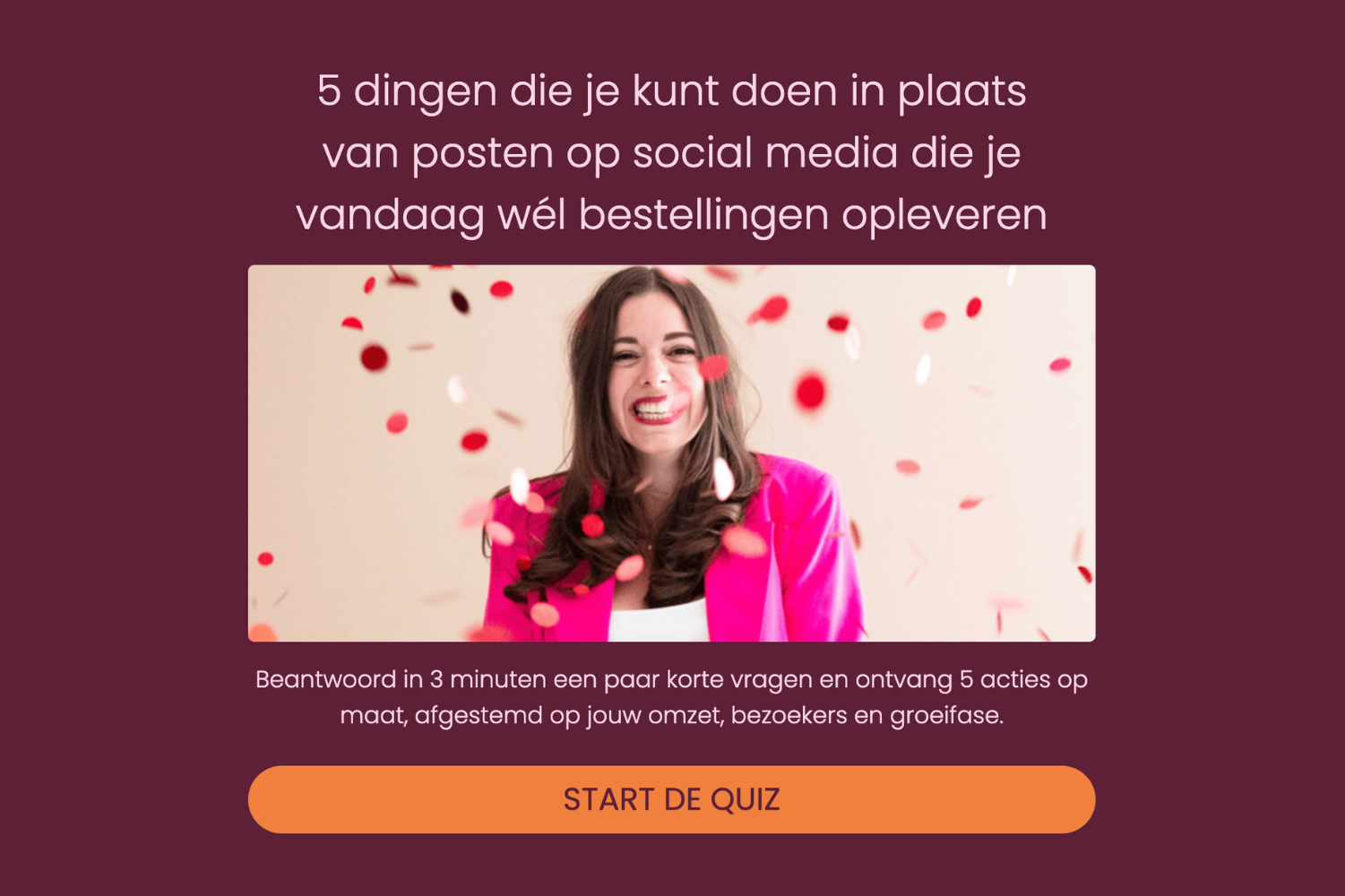 Beantwoord in 3 minuten een paar korte vragen en ontvang 5 acties op maat, afgestemd op jouw omzet, bezoekers en groeifase.